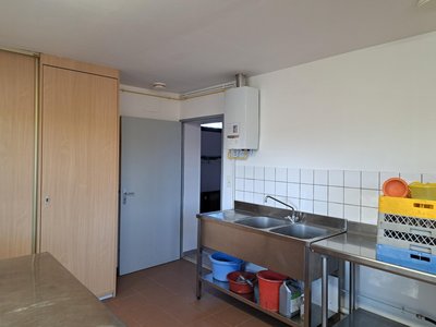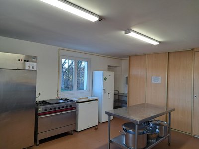 La salle comporte une cuisine équipée avec une chambre froide, de la vaisselle et tout le nécéssaire pour cuisiner, des tables et des chaises pour une centaine de convives.